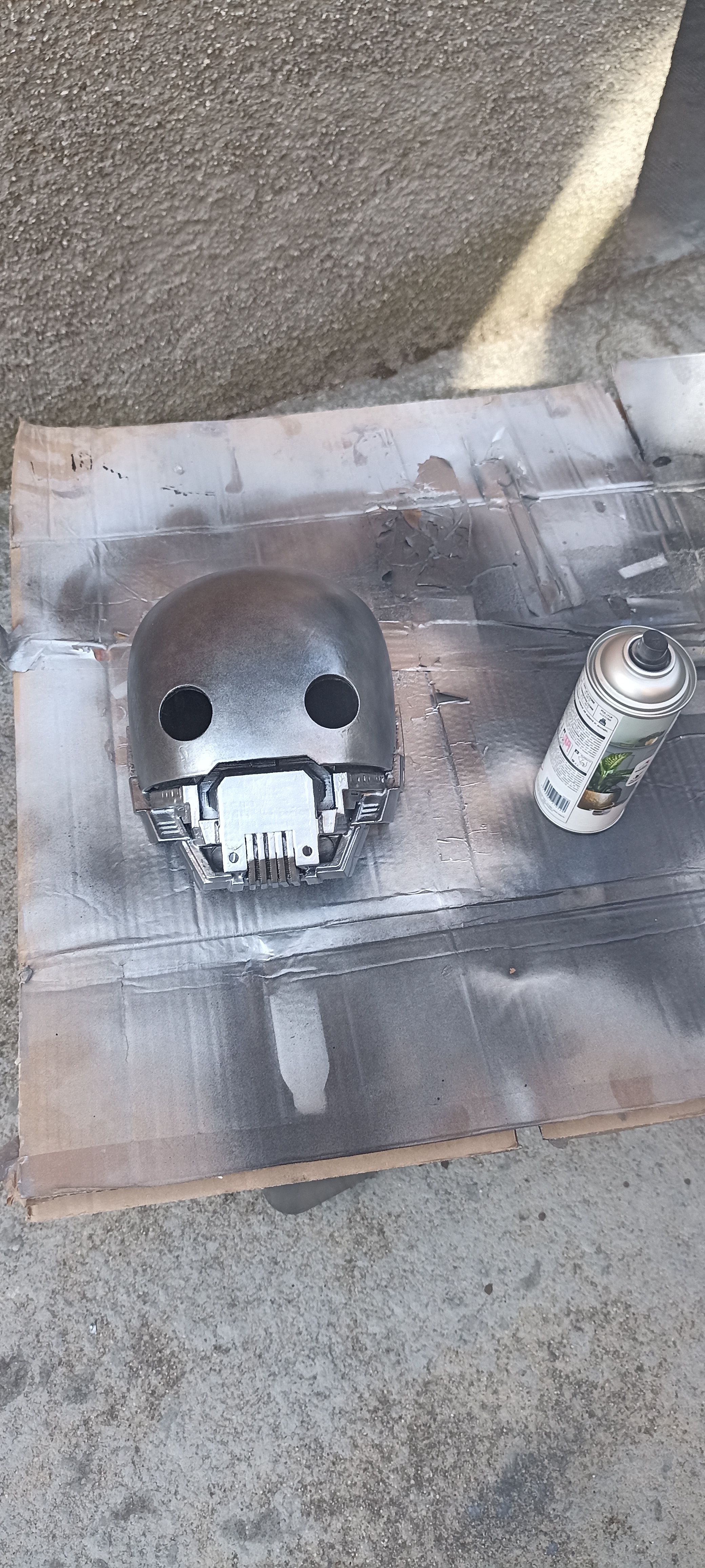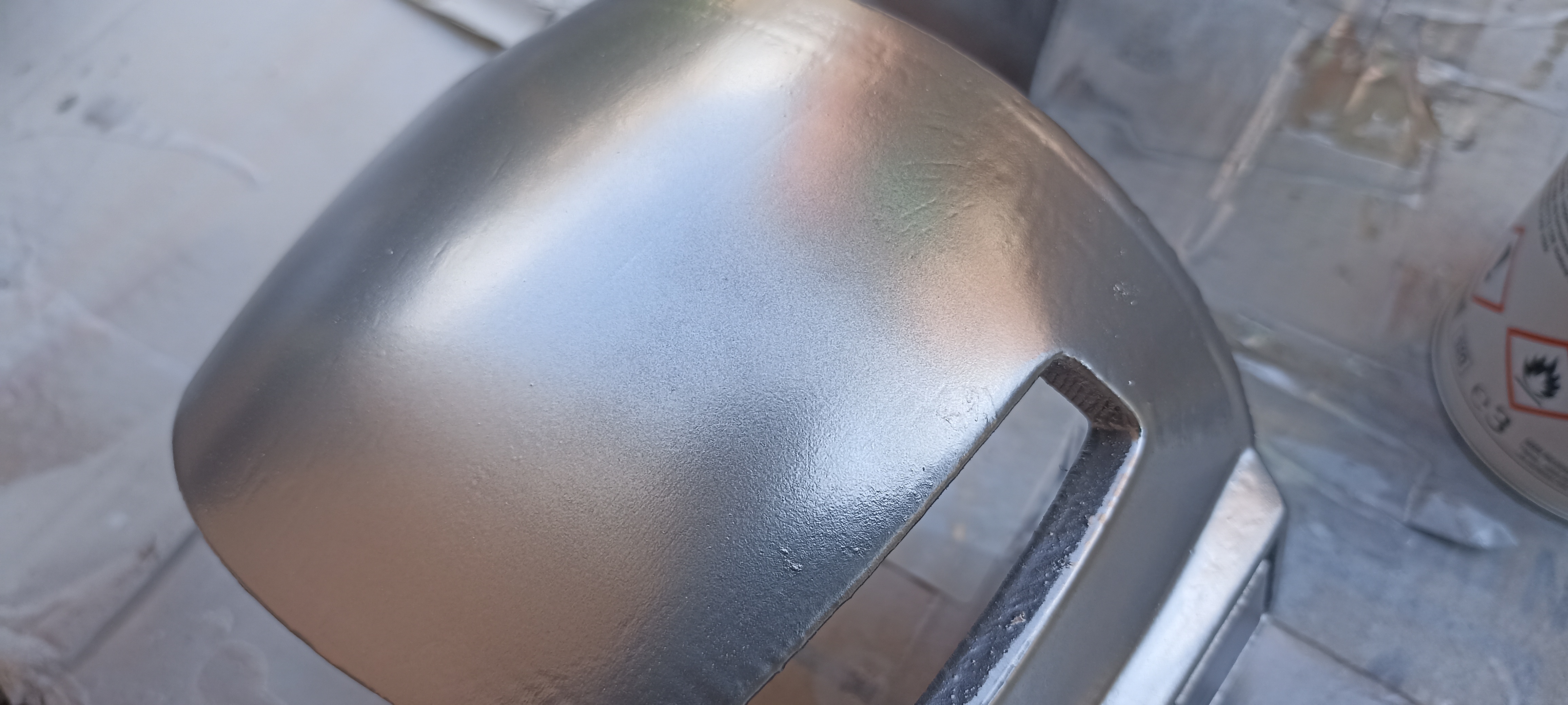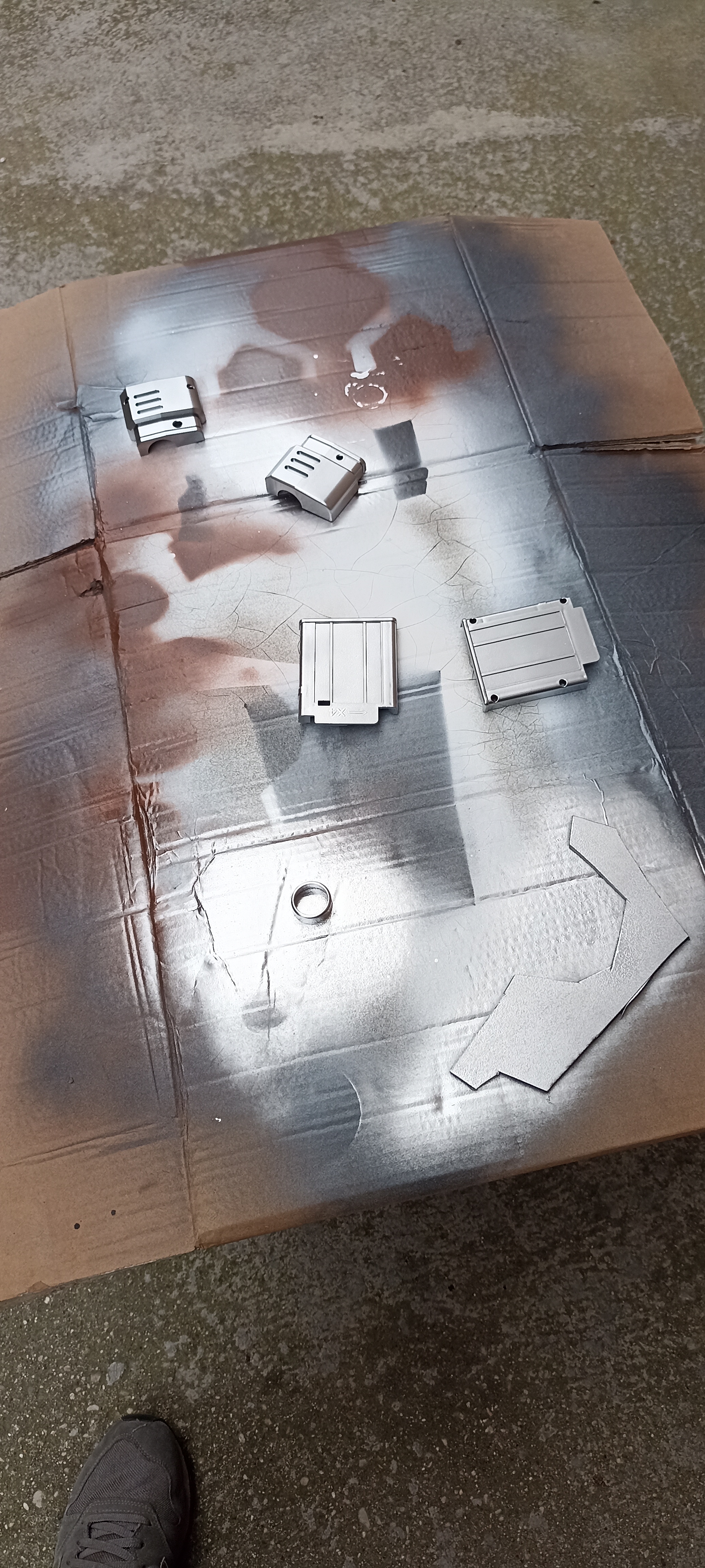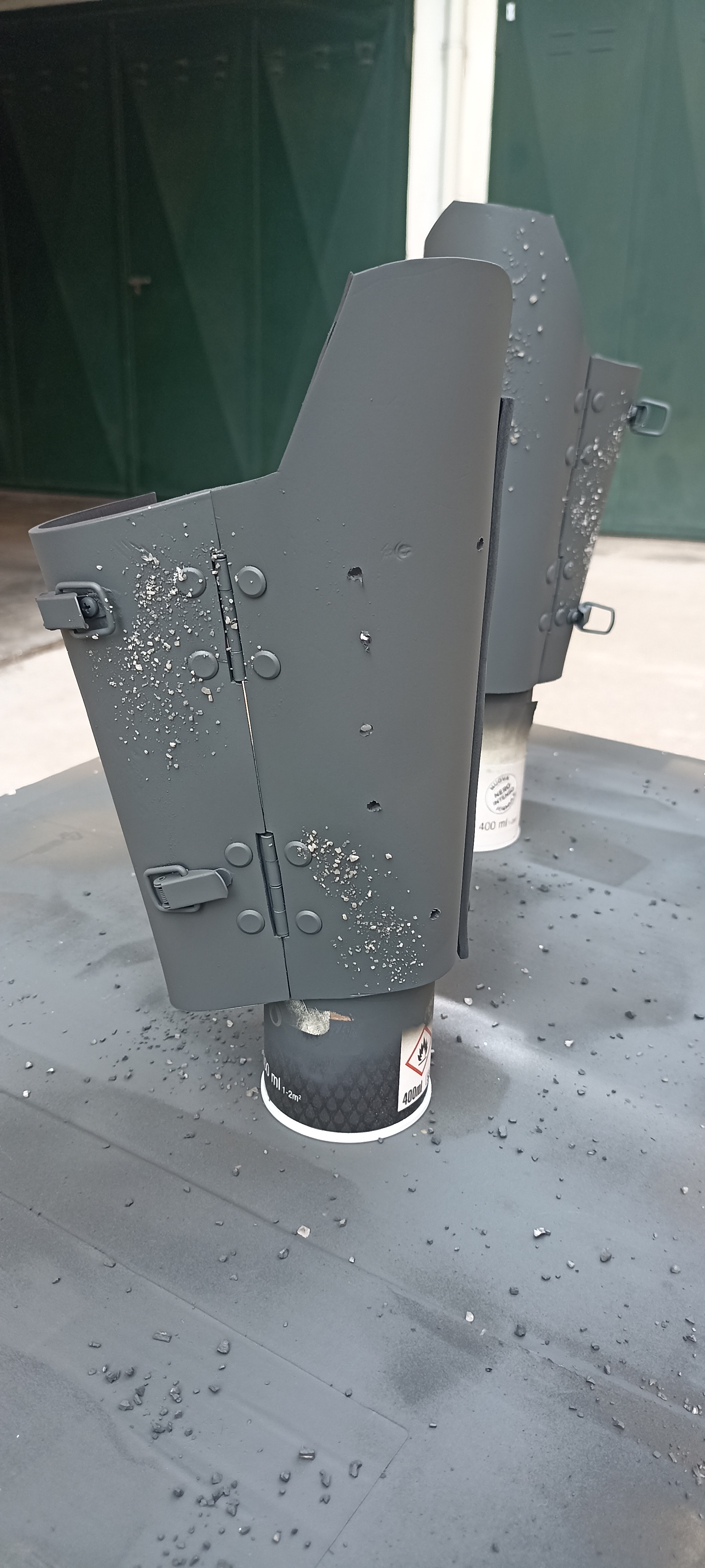 Then silver and subsequently after some masks with toothpaste I made the first real base of the three colours, RAL 446C Grey, using the salt technique.
