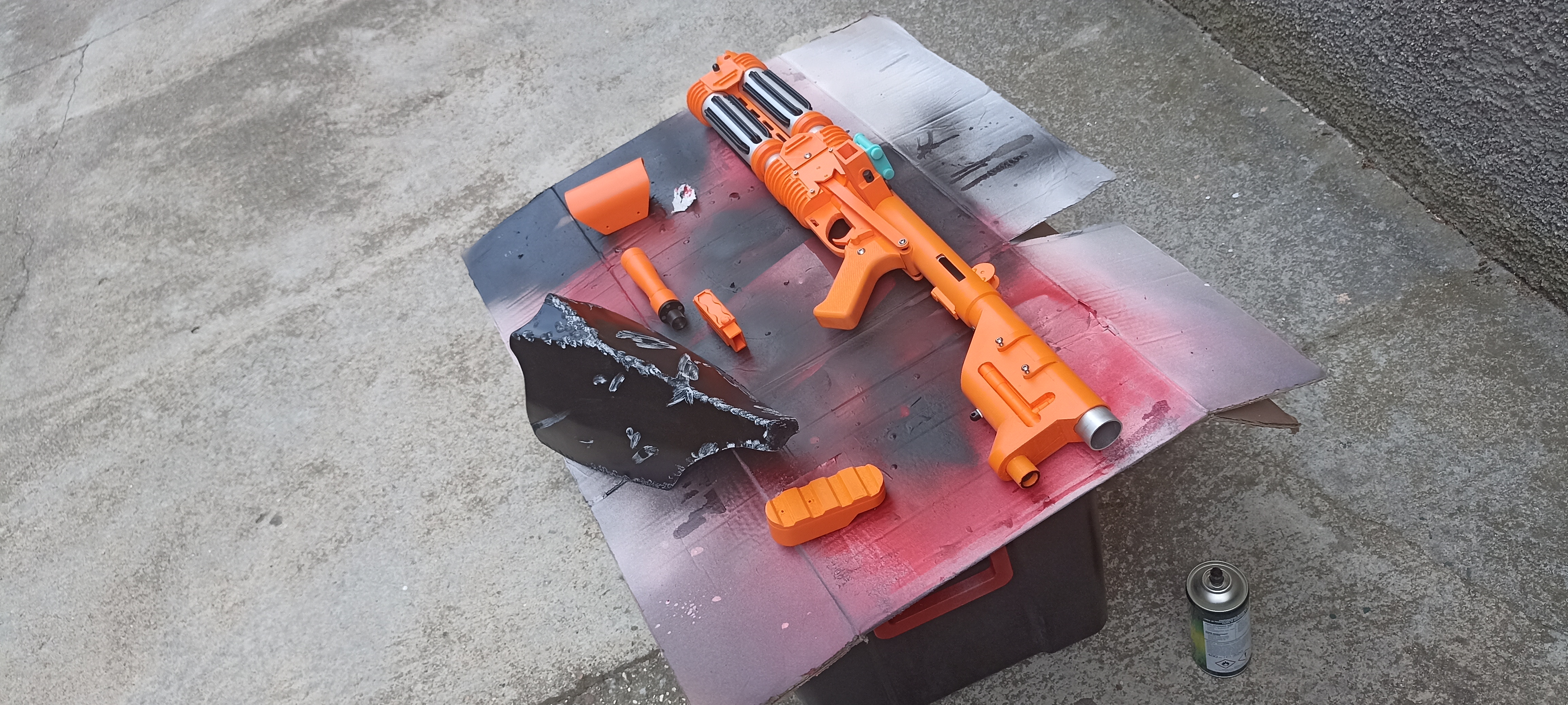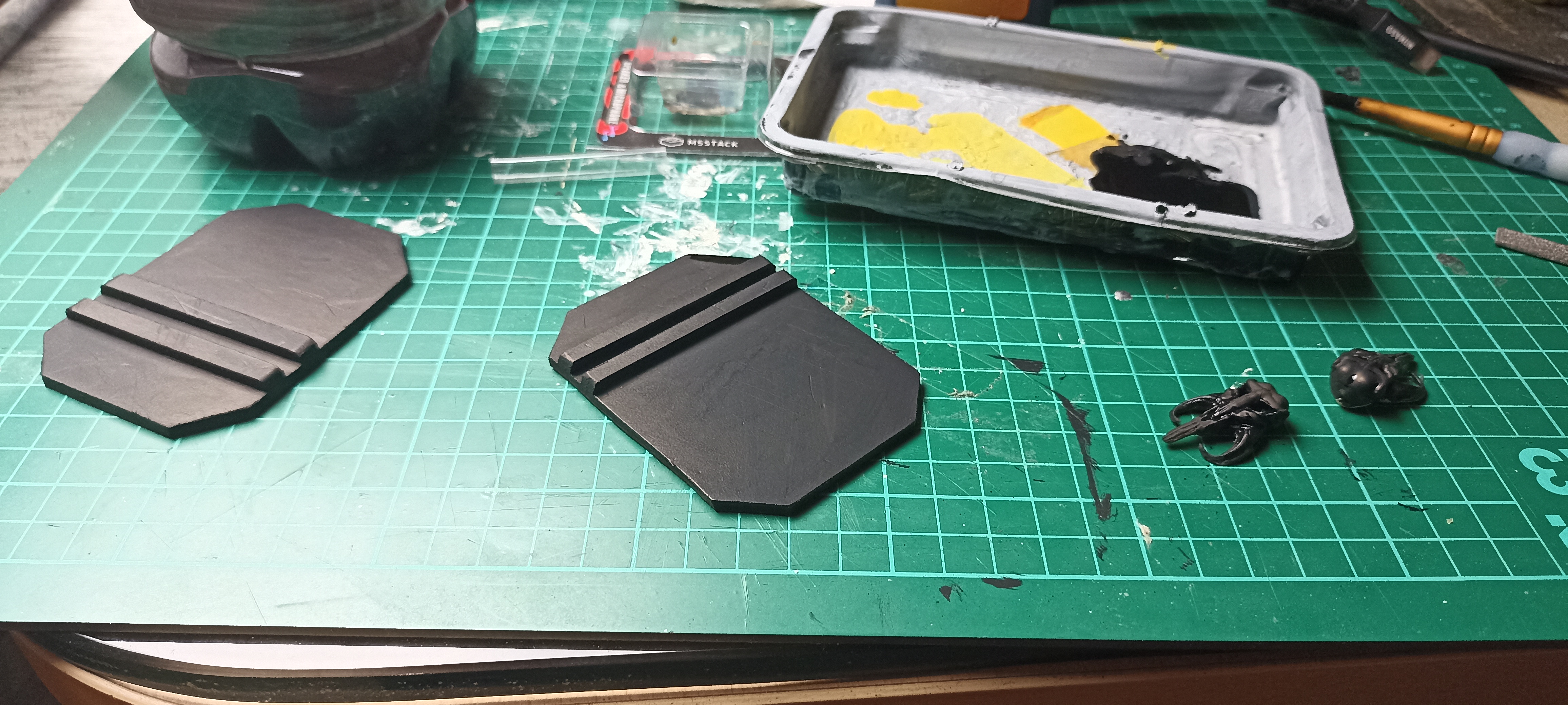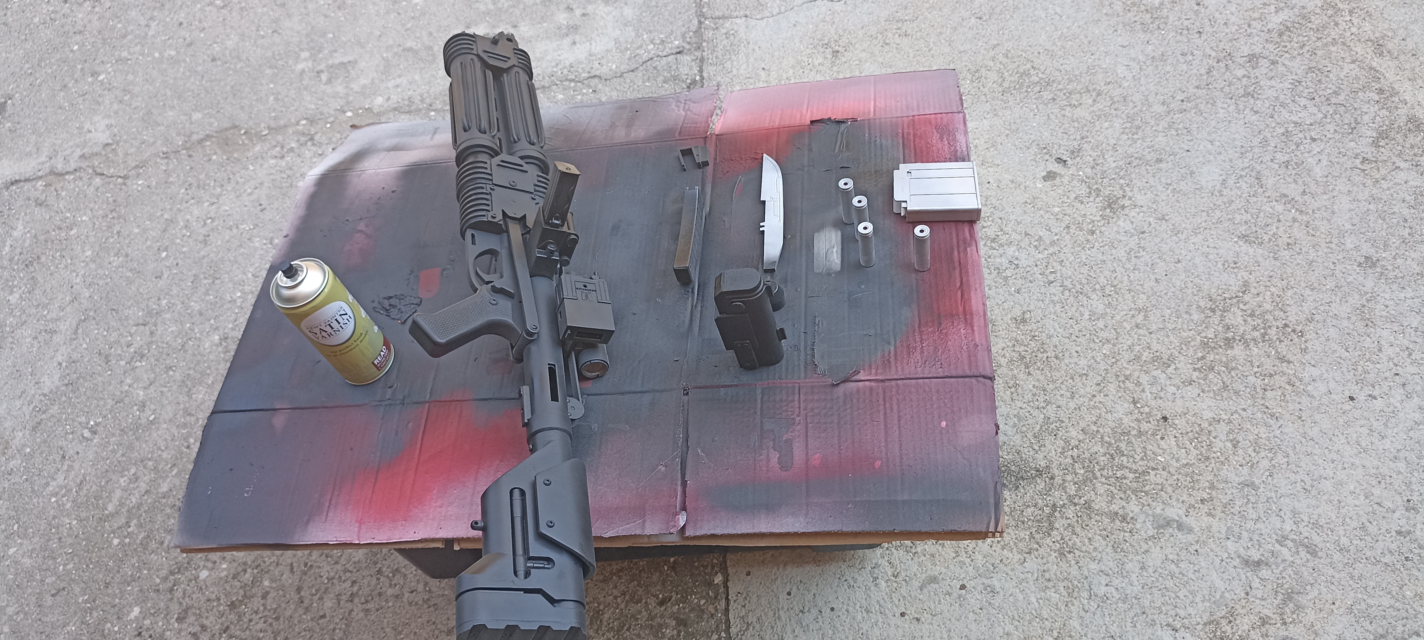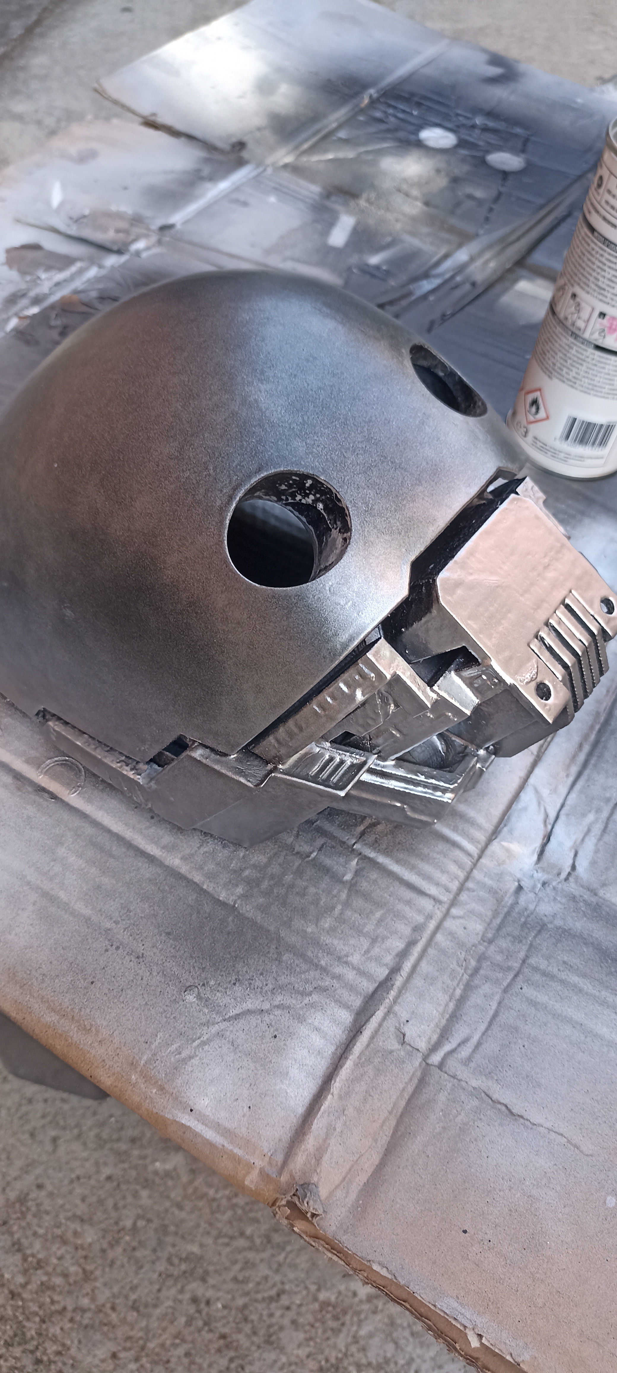 Then silver and subsequently after some masks with toothpaste I made the first real base of the three colours, RAL 446C Grey, using the salt technique.
