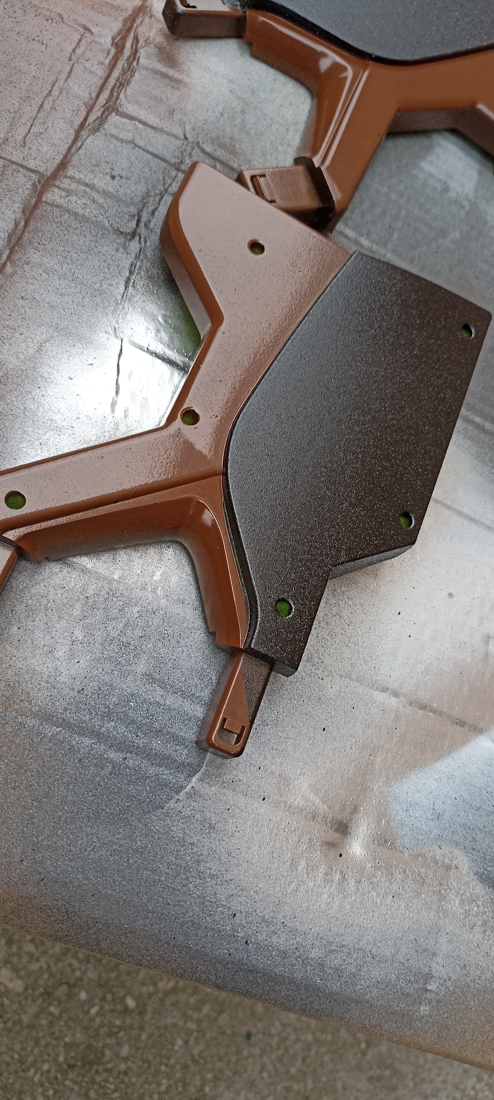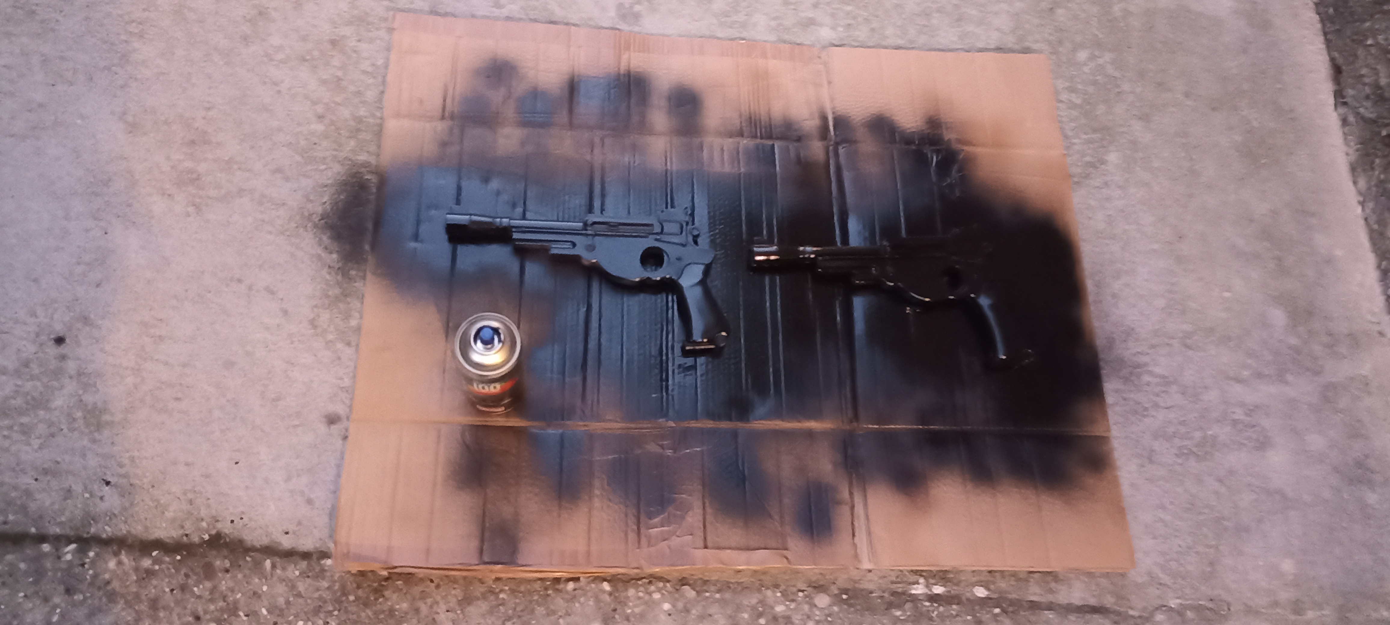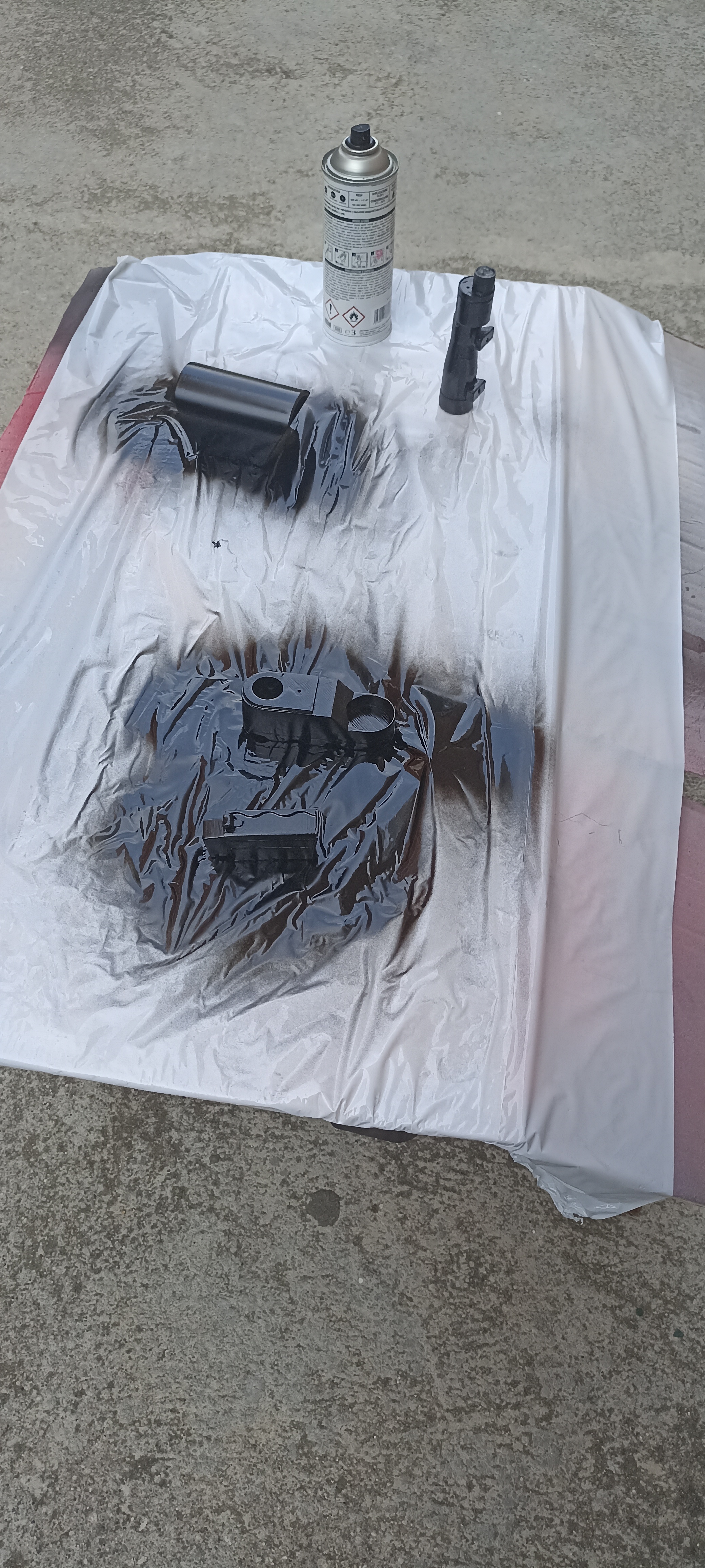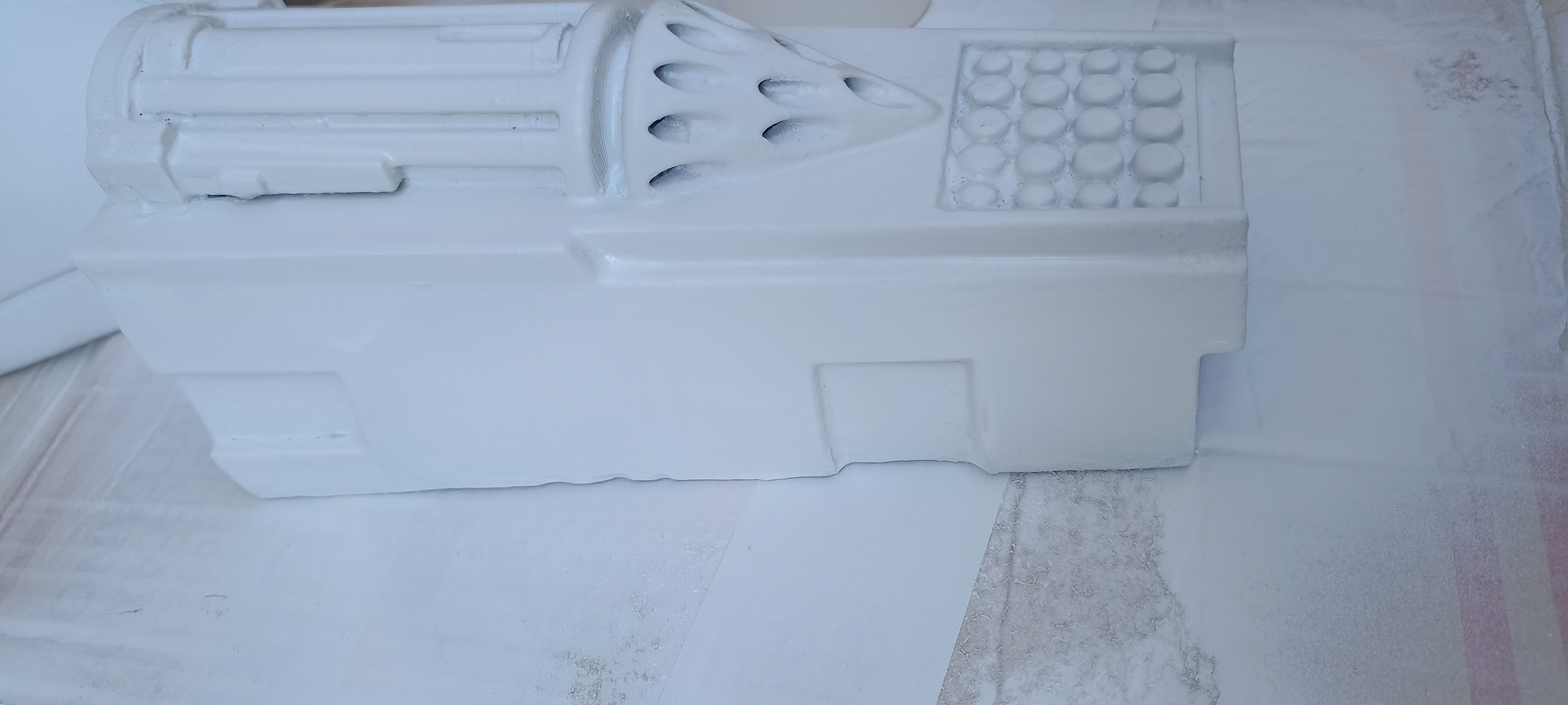 Then silver and subsequently after some masks with toothpaste I made the first real base of the three colours, RAL 446C Grey, using the salt technique.