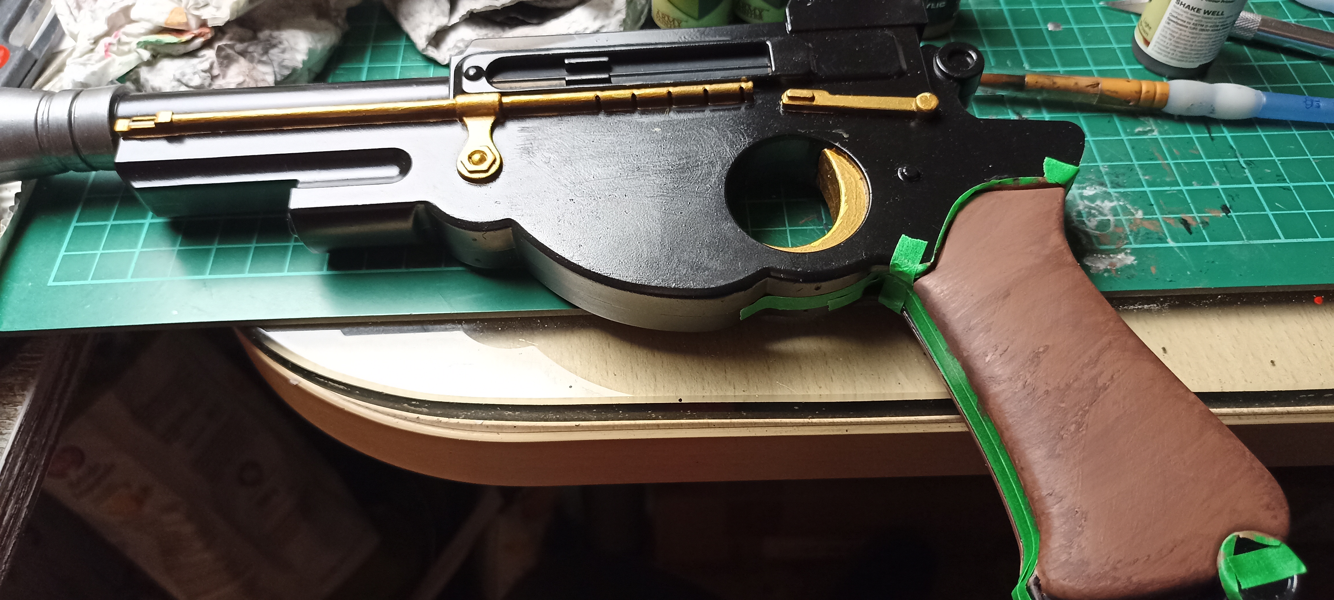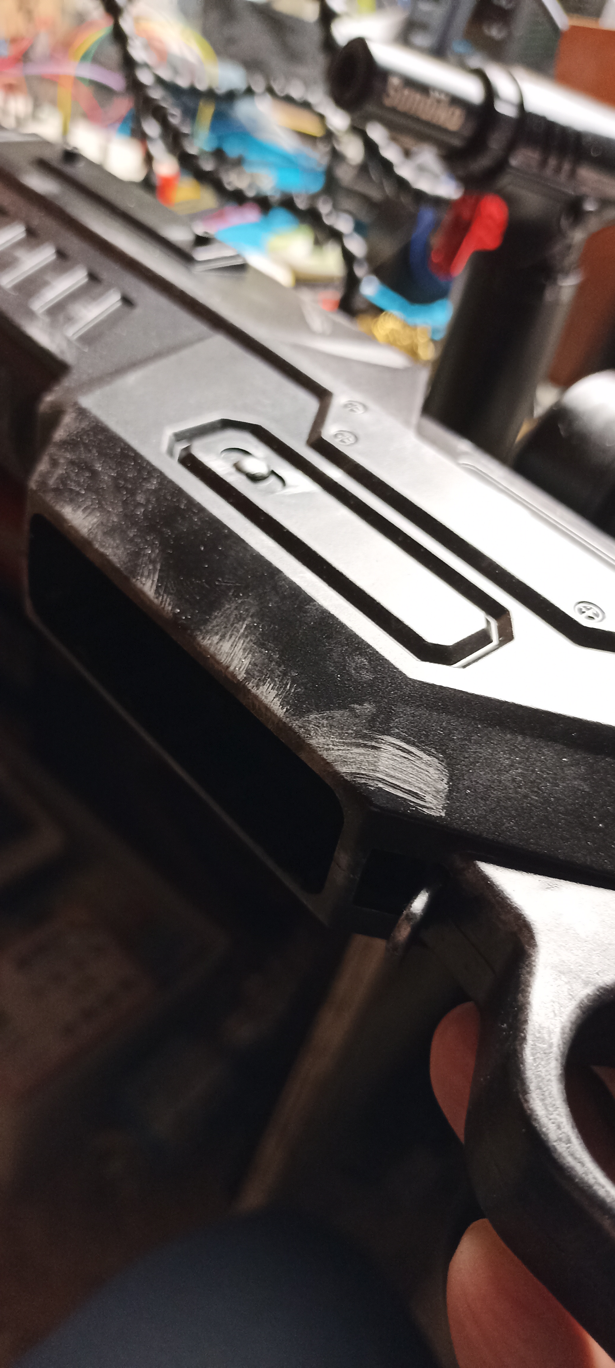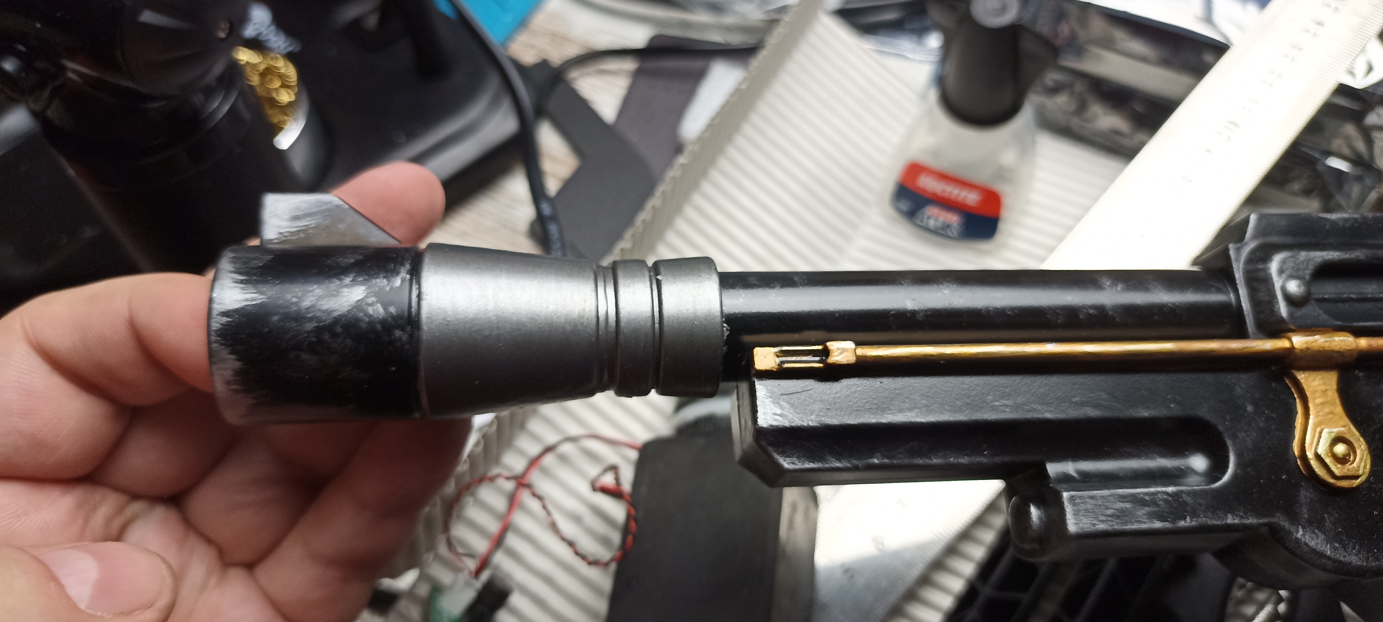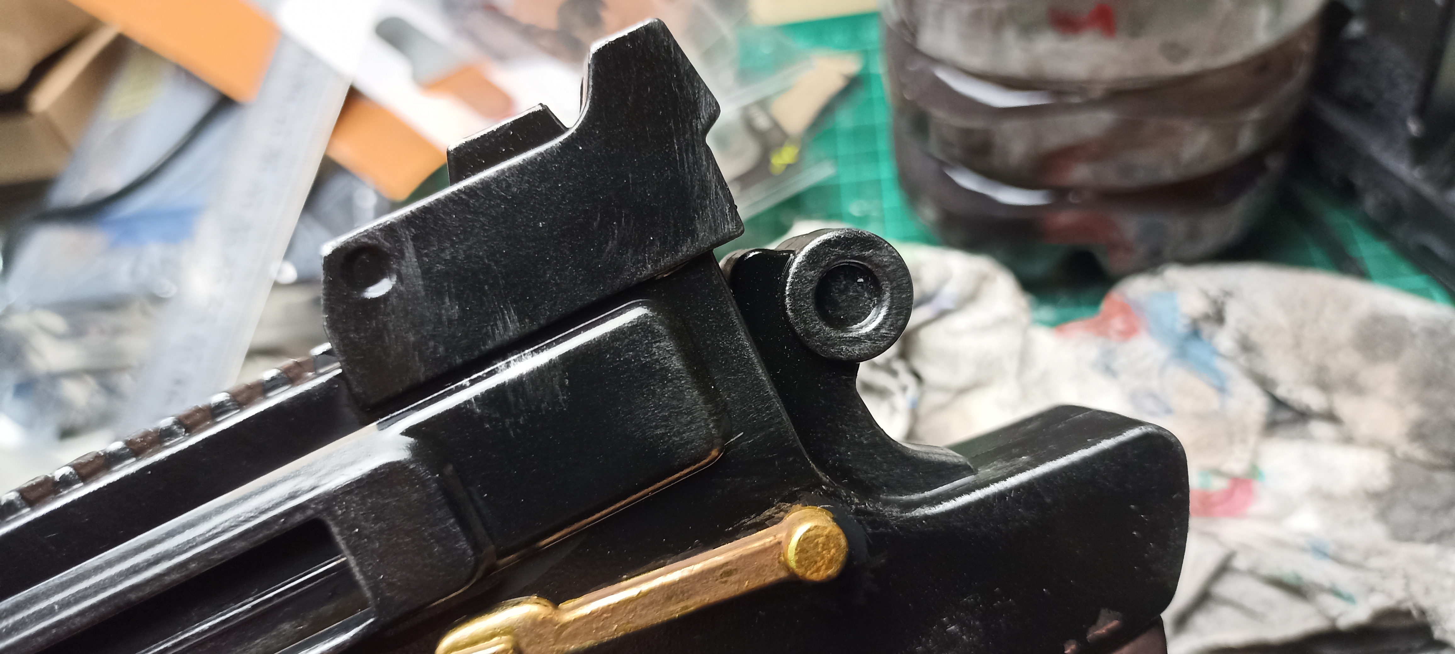Dettaglio fondo impugnatura weathering con drybrush silver.