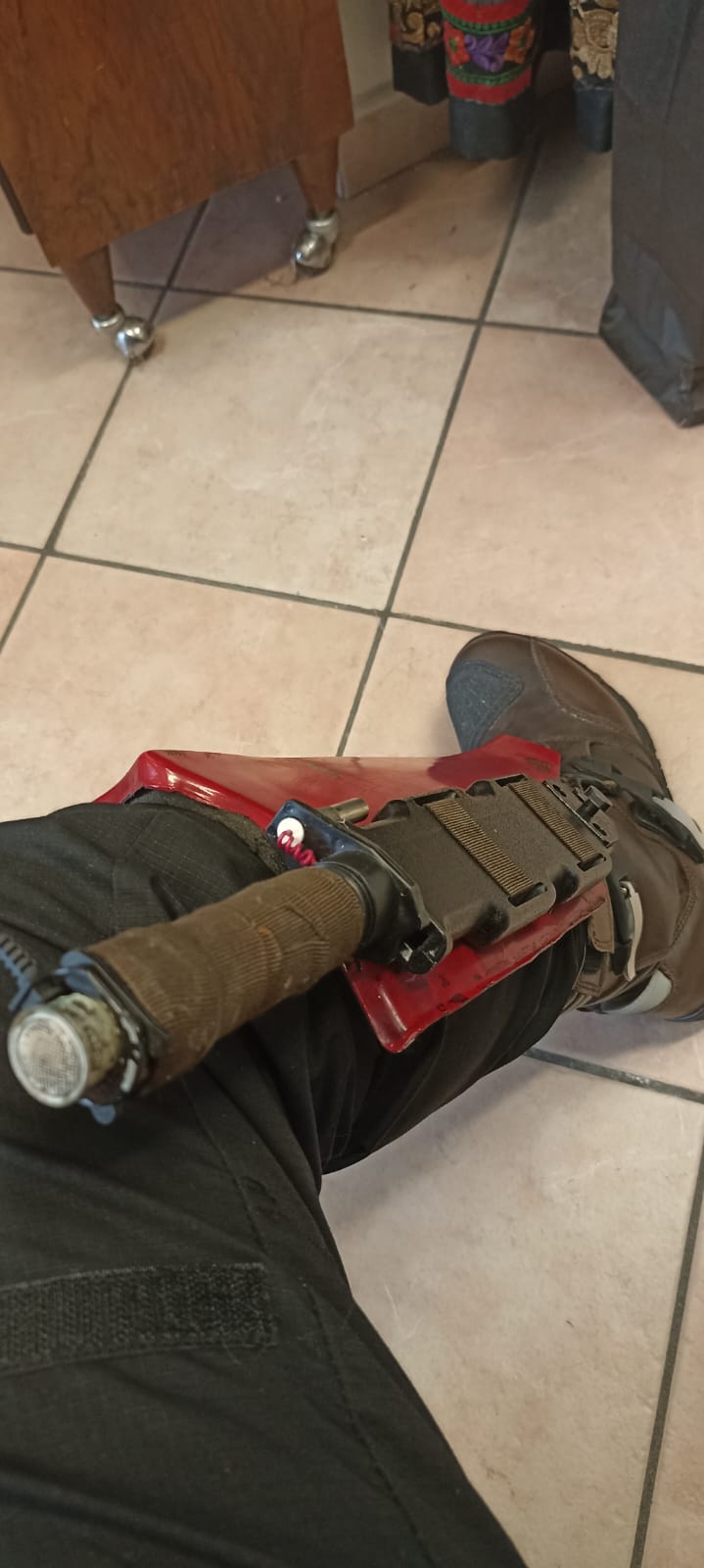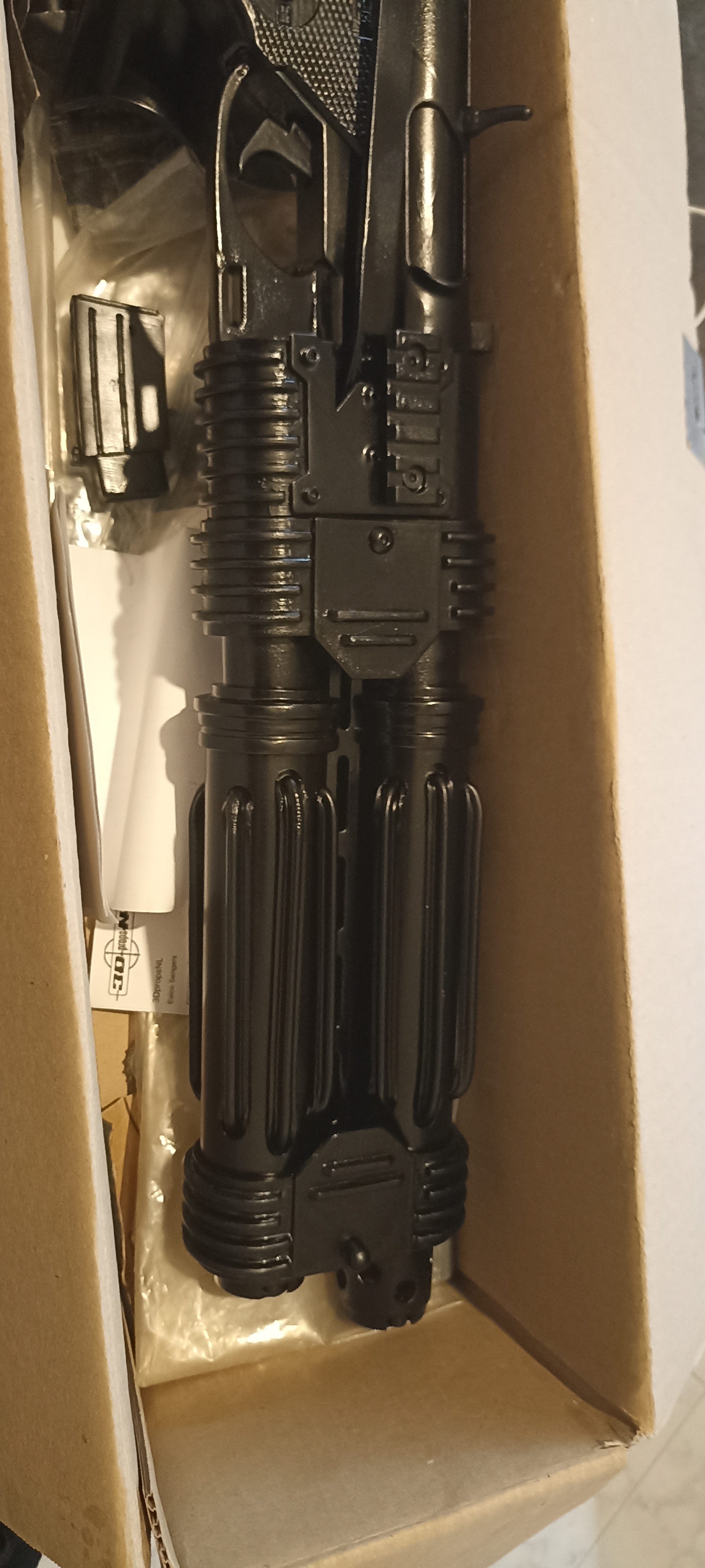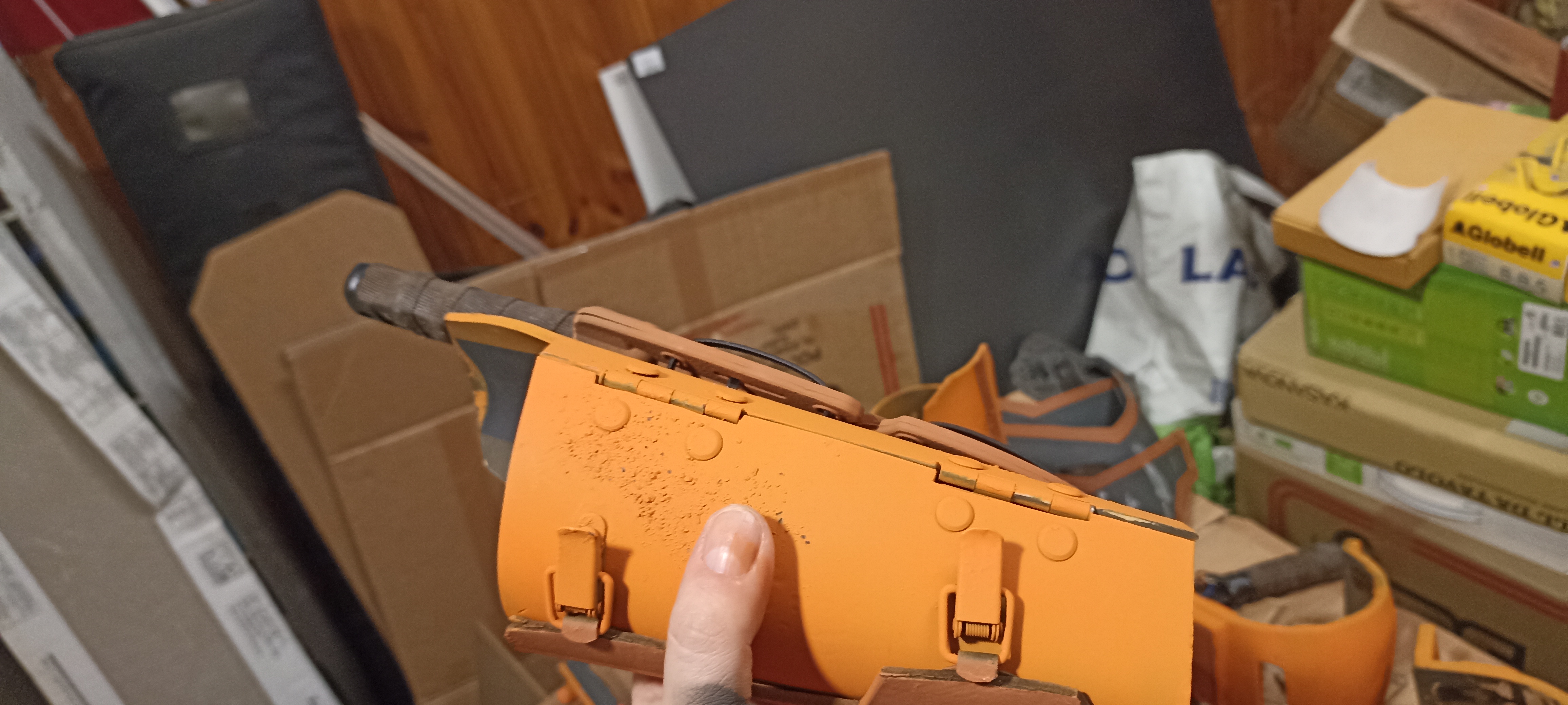 The rigid shin is recovered from a shock phase II clone. In practice the two survivors found a shock phase II clone and took the shins, dividing them one each and reusing them to adapt them to their armor, without repainting them.